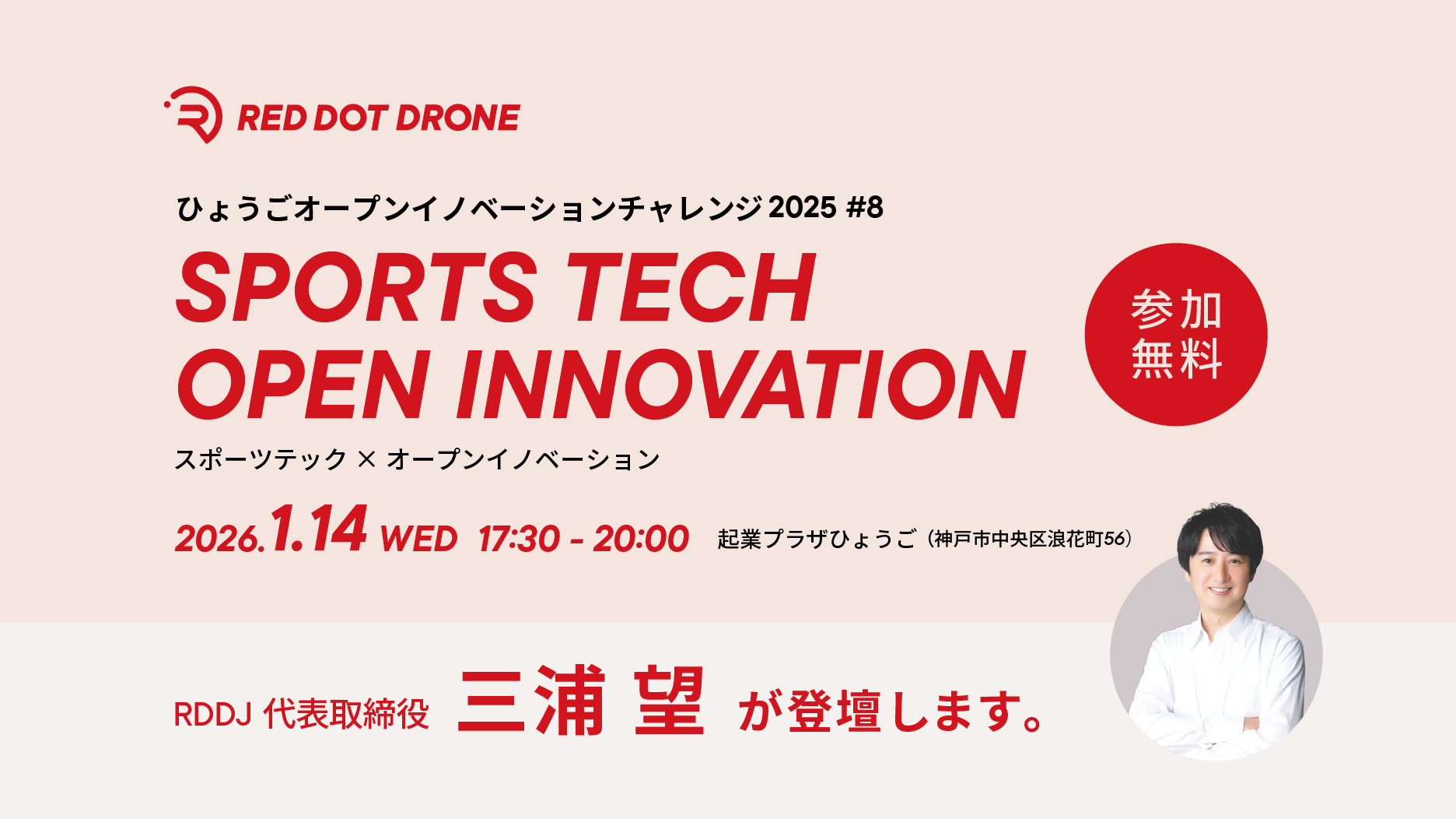 ひょうごオープンイノベーションチャレンジ2025 #8 〜スポーツテック×オープンイノベーション〜 RDDJ 代表取締役 三浦 望 が登壇いたします。 ▶︎日時 2026/1/14 (水) 17:30 - 20:00 ▶︎場所 起業プラザひょうご 神戸市中央区浪花町56 ドローンとソフトウェアで競技の「観たい」「聴きたい」「理解したい」を進化させ、次世代の観戦・運営体験を創出するRDDJ。 スポーツテック×オープンイノベーションで何を語るのか。 ご期待ください! お申し込みはこちら!